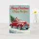 This card shows a festive holiday scene, featuring a jolly Santa Claus driving a classic cherry-red car through the snow. Santa looks happy in his red suit and hat, with his white beard flowing as he drives the vintage convertible. In the back seat, there's a beautiful green Christmas tree ready to be decorated, adding a natural touch to the scene. The car shines with its chrome bumpers and white tires, glowing headlights cutting through the snowy night. At the top of the image, the words "Merry Christmas & Happy New Year" are written in a graceful script, matching the warm colors of the season. The design is balanced and inviting, with Santa's gaze drawing you in and the car angled to show movement. This card has a sophisticated, nostalgic feel, with clean illustrations against a cool background, making the reds and greens stand out. With its cozy holiday vibe, this card is perfect for spreading some festive cheer 🎅🏼🎄🎁.