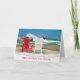 Boné de Papai Noel numa cadeira branca de Adirondack numa praia com borda rasgada. O texto é editável.