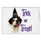 Serão truques ou ameaças neste Halloween? Nosso design de Natal tem sua raça favorita de cachorro, o Santo Bernard, vestindo um chapéu de bruxa. Adicione um pouco de 'Hocus Pocus' a All Hallows este ano!