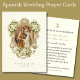Com uma bela imagem católica tradicional do noivado de Maria e José com uma borda dourada decorativa acentuada com flores brancas e um fundo de renda branca. Uma oração em espanhol está no verso para os noivos. Todo o texto e fontes podem ser modificados.