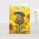 Um sapo giro vestindo uma palha que se senta sobre um girassol, cercado por girassóis O texto do dentro pode ser mudado.