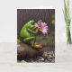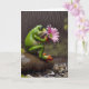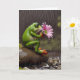 Um sapo branco se senta sobre uma rocha e segura uma margarida rosa na chuva. Todo texto é editável.