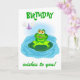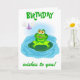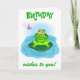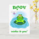 Um sapo de desenho animado sentado em uma lipad esperando para atacar uma libélula desavisada. Concebido para uma placa de saudação.