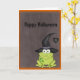 Sapo adorável num chapéu de bruxas com um coração negro pendurado. Desejos de Halloween sobre fundo de laranja e cinza