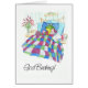 Um cartão Get Good com a saudação em dinamarquês, com um sapo verde, deitado na cama com uma garrafa de água quente e remédio, uvas e flores ao seu redor, a partir de uma ilustração branca pintada à mão por Judy Adamson. Você pode adicionar sua própria mensagem de dentro, se desejar.