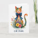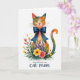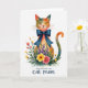 This card shows a watercolor-style cat centered on a bright white background, eyes closed with a small, tender smile that feels like a quiet moment shared with someone close ❤️. Its body blends warm orange and soft red into cool teal, like early morning light washing over its rounded shape. A deep sapphire-blue bow sits neatly at the neck, adding a crisp accent against the softer color transitions. From the lower half, a garden of spring flowers spreads outward, mixing sunny yellow blooms, gentle pink petals, and light purple blossoms among fresh green leaves. Tiny orange speckles float around the flowers, like little sparks drifting through the air. The artwork blends the animal and the floral scene so smoothly that it looks like the cat is lovingly “growing” the bouquet, with fine whiskers and petal textures adding intimacy 🌼. Any text would sit above the cat in a light gray tone, with a smaller line placed below the bouquet in muted teal. The blue bow is tied in a symmetrical knot with two long ribbon tails pointing down toward the flowers.