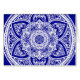 Esta mandala branca senta-se sobre um fundo azul brilhante e profundo. As cores são inteligentes e introspectivas. Parte da Coleção Bardh Mandala.