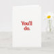 This Valentine’s Day card shares affection with a dry sense of humor and a confident message. Centered on the card, the words “You’ll do.” appear in a deep romantic red, written in a classic serif-style font that adds a timeless feel. The lettering stands out clearly against a bright white background, drawing your eye straight to the message. A subtle paper-like texture adds warmth and depth, giving the card a handmade look. The period at the end adds emphasis, turning a short phrase into a statement of commitment and acceptance. This card is perfect for couples who appreciate honesty, humor, and love that doesn’t need grand gestures to feel meaningful.
