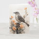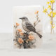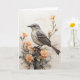 Sassia-de-encontro-pousada-em-um-toco-de-árvore-cercado-por-lindas-flores-laranja-claro. Cartão-de-felicitações-em-branco-para-aniversário, aniversário-de-casamento, novo-bebê, agradecimento, pêsames, etc.