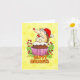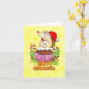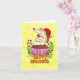 Este cartão mostra um pequeno ouriço vestindo um chapéu de Santa. Ele está feliz sentado em um cupcake de pudim de Natal, balançando no bago vermelho que estava em cima. O pudim de ameixa tem o tamanho de um bolo de xícara e é embrulhado em um copo de papel rosa. Os ramos de pequenos pinheiros e os ramos com as bagas vermelhas de inverno foram colocados em volta como decoração. O fundo é amarelo com um padrão de estrela alaranjado e desbotado. Sob o cupcake está escrito "Feliz Feriados" em letras laranja.