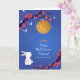 Bonito fundo azul com lua de lua e coelho coelho é perfeito para enviar a pessoas um Feliz Festival de outono de Médio. Adicione seu nome de família ou remova-o se preferir. dentro vazio.