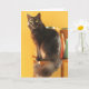 O gato preto está sentado sobre uma mesa cheia de cones de fio, o fundo é laranja/bronzeado. Personalize o dentro de saudação de "Que seu dia seja caloroso e aconchegante" - "Parabéns!" para o seu próprio texto.