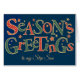 Um cartão de Natal de na moda para o Step Son, com "saudações da temporada" em letras verdes e brancas e escuras e verdes e brancas, esboçado em um fundo azul profundo e espalhado com efeito ouro e estrelas vermelhas. Você pode mudar facilmente a mensagem dentro neste design digital baseado em texto por Judy Adamson e se você não encontrar um cartão para a pessoa para quem deseja enviá-lo, há uma versão frontal personalizada que você pode personalizar.