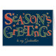 Um cartão de Natal de na moda para uma madrinha, com "Saudações da Época" em letras verdes e brancas e escuras e brancas e bolinhas, esboçado em efeito ouro sobre fundo azul profundo e espalhado com efeito ouro e estrelas vermelhas. Você pode mudar facilmente a mensagem dentro neste design digital baseado em texto por Judy Adamson e se você não encontrar um cartão para a pessoa para quem deseja enviá-lo, há uma versão frontal personalizada que você pode personalizar.