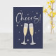Os óculos de champanhe com a palavra Cheers enquanto brindam. O dentro diz, desejando um ano fantástico à frente, Feliz ano novo! Você também pode editar o texto para usá-lo para um casamento ou outro cartão de comemoração.