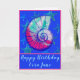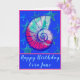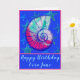 Uma bonito concha espiral marinha Nautilus fica em frente a um belo fundo azul-real oceânico. Peixe-estrela de turquesa brilhante flutua dentro do azul rico. A casca do mar é rosa-rosa claro, fúcsia, turquesa, e azul-Marinho da meia-noite. O dentro de saudação que o cartão diz: Que os seus anos vindouros estejam cheios de dias felizes. Feliz aniversário! O nome do destinatário está sob a concha na frente do cartão. O peixe-estrela azul é dentro e na parte de trás do cartão. As costas também têm modelo para o mês e ano.