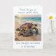 A coastal themed thinking of you friendship card to say hi and keep in touch with a friend when travelling with an illustration of a mama sea turtle and baby crawling into the blue ocean waves on a sandy beach.