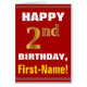 Este simples design de cartão de saudação com tema de aniversário apresenta um desejo de aniversário quente como "segundo aniversário FELIZ, Primeiro Nome!" na frente, em texto a negrito sobre fundo de cor vermelha. O número de aniversário tem uma aparência falsa e imitada de cor dourada. O nome na frente pode ser personalizado. O dentro apresenta uma mensagem de aniversário personalizável. Um cartão de boas-vindas como este pode ser uma maneira divertida de fazer votos de aniversário a alguém que comemora o seu segundo aniversário. [~Z0000276]