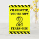 A frente deste design de cartão de saudação temático de aniversário divertido e atencioso apresenta um nome personalizado e a mensagem "VOCÊ ESTÁ COM 2 ANOS!" em um estêncil preto inspirado em um fundo amarelo. Há também um padrão de listras amarelas e pretas que se chama olho nas bordas superior e inferior da frente. O dentro apresenta uma mensagem de saudação de aniversário personalizada, ou talvez possa ser apagado e deixado o vazio se uma mensagem for escrita manualmente. Um cartão de aniversário como este pode ser uma maneira divertida de enviar desejos de aniversário a alguém que comemora seu segundo aniversário. [~Z0000413]