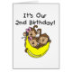 Três macacos pequenos, duas raparigas e um rapaz, e uma grande banana amarela em T-shirts de segundo aniversário Triplets, fato físico, sacos de tote, cartões, autocolantes, ímanes e muito mais.