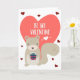 Cartão de saudação do dia dos namorados com um esquilo fofo de desenho animado segurando um presente com a legenda "Seja meu namorado" sobre um grande coração rosa cercado por pequenos corações vermelhos.