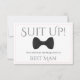 Use esta "melhor carta de proposta de homem" para pedir ao seu amigo especial, irmão ou outro membro da família para ser o melhor homem no seu casamento. Ele apresenta uma imagem de um arco preto em um fundo branco e uma borda rosa fina. O texto diz: Encaixe! Seus serviços são solicitados como o melhor homem" Há um espaço para inserir uma nota especial perguntando "você será meu melhor homem?" assim como os nomes dos casais de casamento e a data do casamento. Todos os campos são totalmente personalizáveis.