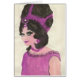 Escreva o esboço de uma mulher dos anos sessenta, watercolored com um vestido roxo pinkish, os brincos, a colar e a fita funcionando através de seu cabelo.