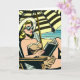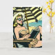 Apenas dizendo o cartão de amizade. Estilo de banda desenhada de arte pop, preto e amarelo, ai art retratando uma mulher lendo um livro na praia em óculos escuros e vestindo um chapéu de sol debaixo de um guarda-chuva.