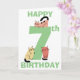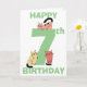 Cartão de aniversário bonito e divertido, com 7, com um grande número sete na cor verde. Um gatinho de rabisco está sentado em cima do número e dois gatinhos de rabisco estão sentados na base do número, cada gato é único com uma cor diferente e em uma posição diferente. Por cima e por baixo dos gatos, encontram-se as palavras Happy (no topo da carta) e Birthday (no fundo da carta) em texto verde. Dentro no cartão você encontrará gatos ainda mais bonitinhos com um modelo para adicionar sua mensagem de aniversário e, finalmente, outro gato rabisco na parte de trás do cartão.