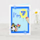 Eu sou um cartão de 7 anos com palhaço engraçado, pinguim, sorvete e balões, num fundo azul. Personalize facilmente este design, adicionando ou alterando o texto.