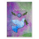 Shalom para Pessach, Dove, Magen David e Olive Branch. Cartão de saudação em papel para Pessach / Passover. Ilustração de uma pomba coberta de aquarelas, ramos de oliveira, e Magen David / Star de David, tudo sobre um fundo de falsos violetas, blues e verdes. Design original, imagem e direito de autor © Shoaff Ballanger Studios.