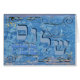 O cumprimento tradicional do Passover, "Shalom Pesach", é mostrado em letras hebréias com flourishes decorativos em um fundo textured, primeiramente nas máscaras do azul