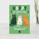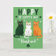 This card shows three stylized cats sitting close together against a rich green background dotted with shamrocks ☘️. In the center is a white cat sprinkled with small green clover shapes, looking forward with wide eyes and a soft smile as if leaning into the company beside it 💚. On the left, a dark teal cat sits upright with an eager, friendly gaze, and on the right, a marmalade-orange cat mirrors that gentle expression, creating a cozy, together-at-the-party feel. Across the top, the text “HAPPY ST. CATTY’S DAY” spans the width in a mix of dark green and white letters that pop against the green field. Near the bottom, the word “Husband” appears as a simple address beneath the cats, set apart so it reads like a quiet note meant for one person. Shamrock icons in different sizes and greens float around the trio, adding movement and guiding your eye from the headline down to the namesake cat. The cats’ rounded shapes and slightly shaded edges give them a subtle sense of depth, with clovers scattered like confetti across the background. The scene is framed by the centered trio, with clover clusters sprinkled above their ears and along the lower corners.