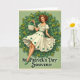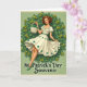 This card shows a retro-style St. Patrick’s Day scene with a young woman at the center, her auburn hair set in soft waves and her smile aimed straight at the viewer like she’s sharing a private joke with a close friend 💚. She wears an off-white dress with green trim at the square neckline and puffed sleeves, tied with a matching sash that draws the eye to her waist. The skirt lifts slightly to reveal a scatter of emerald shamrocks, and her long legs angle outward in a relaxed pose that feels confident and flirty. In one hand she carries a small wicker basket filled with curling green ribbons, as if she’s offering a lucky token to someone just outside the frame ☘️. Around her is a circular wreath of dense three-leaf clovers, dotted with small yellow accents that read like tiny butterflies against a soft sage background. Near the bottom, the phrase “St. Patrick’s Day Souvenir” sits centered in dark green lettering with a light shadow, standing out clearly from the pale ground. The clover wreath forms a neat halo around her, with the yellow touches spaced evenly along the ring.