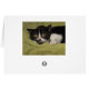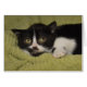 "Shy Tuxedo Kitten" de Catherine Sherman. Um gatinho tímido de smoking de olhos verdes repousa sobre um cobertor verde que combina com os olhos dela.