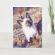 Watercolor painting of Siamese kitten playing in fall leaves.