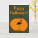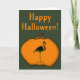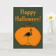 This silly greeting card design features a Halloween Jack-o'-Lantern pumpkin depiction with a flamingo shape carving, along with the saying "Happy Halloween!". There is a customizable message on the inside.