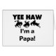 Yee Haw Eu sou um Papa T-shirts, canecas, cartões, adesivos, botões de anúncio, keepsakes de papa, e outros presentes de papa com um cavalo de fivela e design de texto preto ou branco. Estes papa roupa e presentes são perfeitos para avós pela primeira vez ou papas temperados de uma nova chegada!