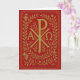 Cartão Símbolo dourado Chi Rho Alpha Omega sobre vermelho