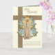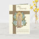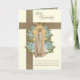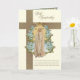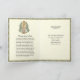 Com um belo cartão de condolências funerário personalizado com uma imagem da Bem-Aventurada Virgem Maria, Nossa Senhora de Fátima sobreposta a uma cruz dourada. Por dentro, a mesma imagem com um versículo bíblico e uma borda floral azul.