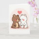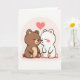 This greeting card shows two cute cartoon bears sitting close together, one warm brown and one bright white, with their heads tilted in until they almost touch. Both bears have rosy cheeks and closed eyes, as if they’re quietly enjoying the moment. A shiny pink heart floats above them, making the feeling of love clear right away ❤️. The background is off-white, and a wide blush-pink curve frames the pair like a soft hug. The simple drawing lines and gentle shading make the bears look plush and calm, which adds to the cozy mood. There isn’t any text on the front, so the picture gets to do all the talking. It feels meaningful to give because it captures that steady kind of closeness you share with a partner or a dear friend 🥰.