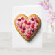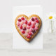 This greeting card shows a heart-shaped cookie with a golden, lightly textured surface, set on a plain white background. A smooth layer of pale pink icing sits on top, following the heart shape and looking slightly rippled. Scattered across the icing are shiny jelly beans in reds, rosy pinks, and a light creamy color, each one catching the light like a little drop of candy. The simple overhead view keeps your focus on the heart and makes it feel sweet and direct. There isn’t any text on the front, which leaves space for you to write your own message and make it feel more personal. It’s a thoughtful choice for someone you care about because the heart shape and candy details say “I’m thinking of you” without needing many words 🥰. It also works for a partner or a close friend, since it feels warm, gentle, and easy to give ❤️. Hope it helps you share your Valentine’s Day feelings in a kind, simple way.
