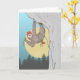 A funny cartoon illustration of a sloth rock climbing, this cute sloth is wearing a climbing harness and is about to slowly clip a bolt on a sport climbing route.