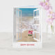 Homem de areia giro com boné de malha em areia de praia na costa oceânica com estrutura de janela