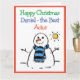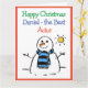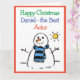 Feliz Natal para um Ator. Cartoon engraçado de um boneco de neve no sol de inverno. Adicionar uma mensagem do remetente.