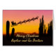 Um cartão de Natal para seu sobrinho e seu parceiro mostrando Papais noeis sobrevoando o deserto. Muitos cactos altos são vistos na silhueta. Deseje um feliz Natal do deserto com um adorável cartão de cor sunset.