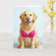 Um recuperador de ouros está sentado e vestindo um sutiã rosa brilhante, olhando diretamente para a câmera com uma expressão alegre, para o obrigado de um sobrevivente do câncer de mama. O texto é editável.