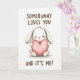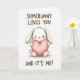 This cute greeting card features a sweet white bunny on a plain white background, setting a simple, cozy scene. The bunny has long ears, a pink heart-shaped nose, lightly rosy cheeks, and black dot eyes with one eye winking like it’s sharing a private joke. It holds a large pink heart in its paws, with soft highlights that make it look smooth and shiny ❤️. Above the bunny, the words “SOMEBUNNY LOVES YOU” appear in a brown handwritten script, curved gently across the top. Below the bunny, “AND IT’S ME!” is written in the same brown handwritten style, sitting near the bottom of the card like a friendly punchline. The pink heart and brown lettering stand out nicely against the white space, keeping the focus on affection and a little humor 💌