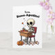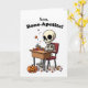Um design de Dia de as Bruxas engraçado para um filho, com um esqueleto lúdico com pernas balançando, rodeado por pilhas de doces e uma lanterna brilhante. O trocadilho "Bone-Apetite!" faz deste cartão uma forma moderada de celebrar a estação, perfeita para os pais que querem enviar um sorriso juntamente com os desejos do Halloween.