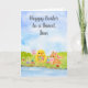 Bright spring colors and playful charm fill this watercolor Easter card, featuring a fluffy baby chick carrying a basket of colorful Easter eggs while a friendly bunny wearing a pink bowtie keeps watch nearby. Set among blooming pastel tulips, the scene captures the excitement and fresh spirit of the season. Thoughtfully created as a special Easter greeting for your son, this cheerful design sends warm wishes, smiles, and joyful holiday fun.